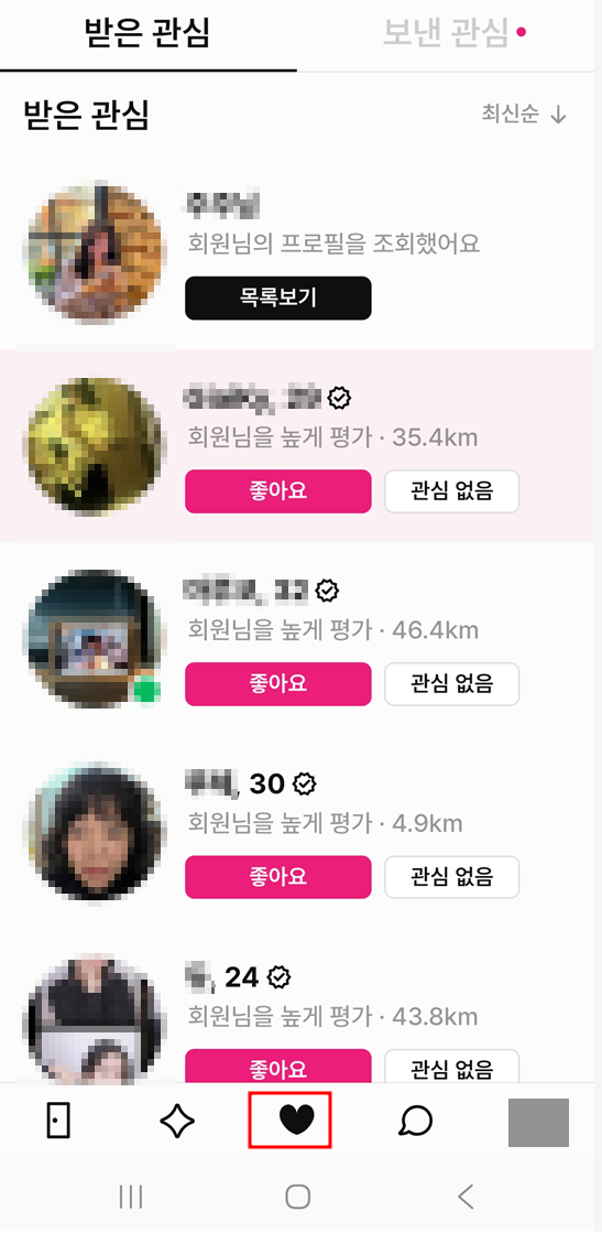 나오는 프로필에 호감 표시를 하면 보낸 관심, 호감 표시를 받으면 받은 관심에 이렇게 분류가 된다. 이런 식으로 닉네임, 거리, 나이 정보가 표시되어 거리나 나이가 중요한 분들은 바로바로 확인할 수 있다.