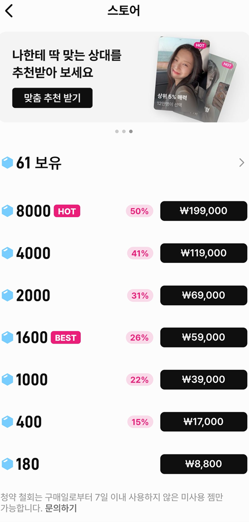 사진 상에 있는 핑크색의 좋아요 버튼을 누르면 "좋아요"와 "다음에 할게요" 버튼이 생기는데 좋아요를 누르려면 40 젬이 필요하다. 즉 과금을 해야만 한다.