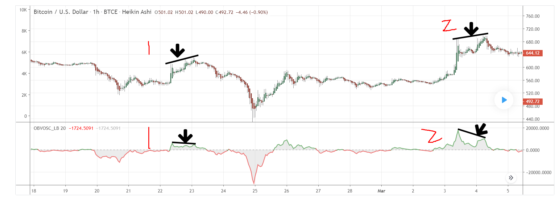 차트에서는 1번과 2번 (주가 차트)는 미묘하게 상승하는 데 OBV 지표는 더 이상 상승하지 못하고 하락하고 있다.