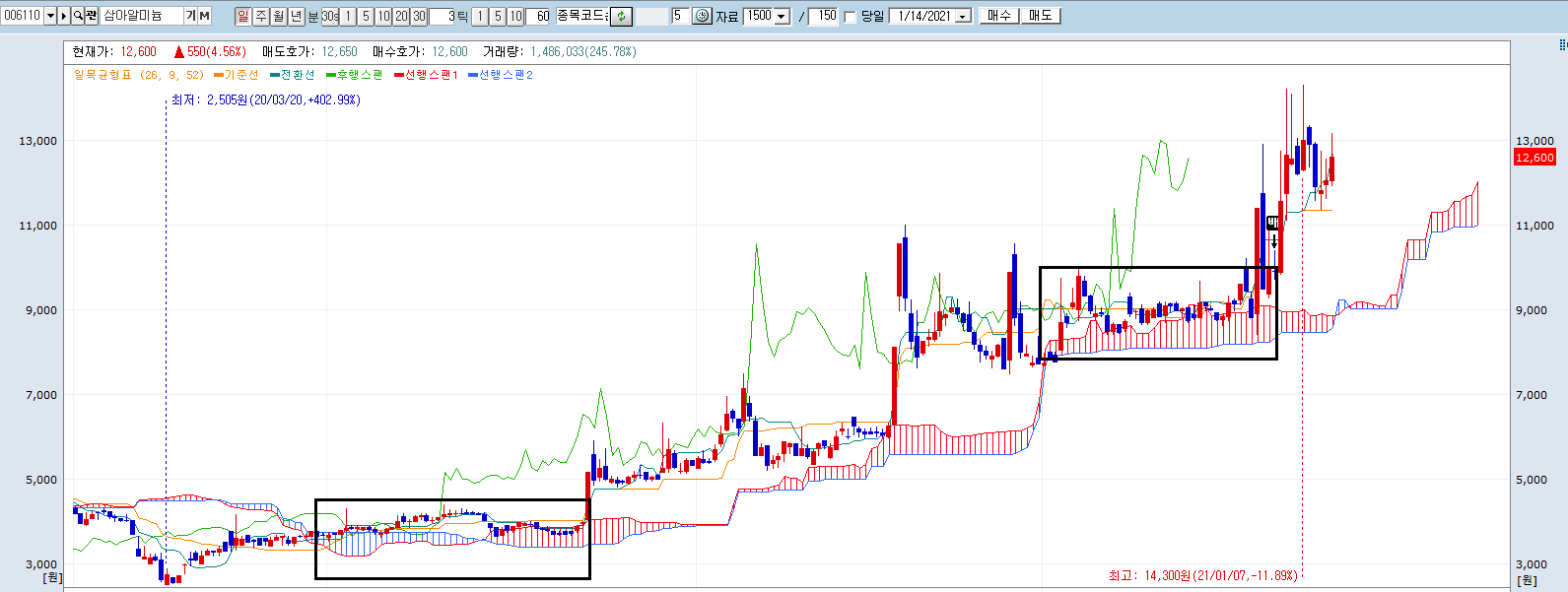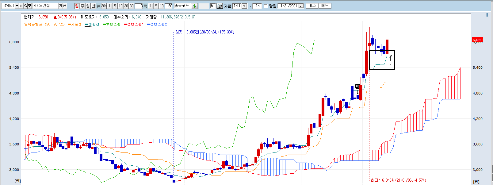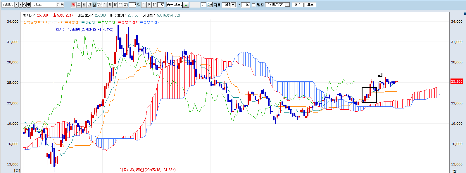 따라서, 주가가 구름 아래에 있다가 서서히 상승하여 막 구름 위에 올라섰을 때 매수 타이밍을 노려볼 수 있고,